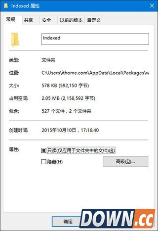 在打开的文件夹中右键单击Indexed目录——属性,点击“高级”。