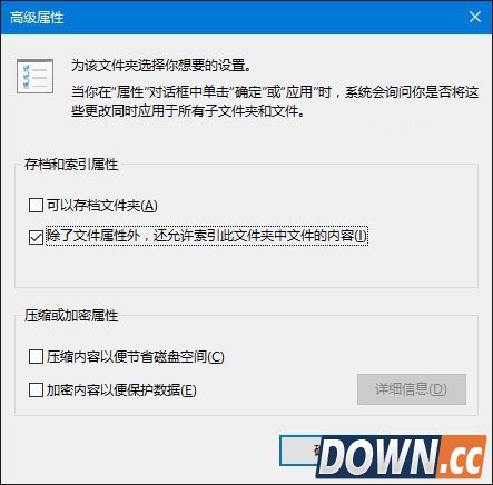 如下图所示,取消勾选“除了文件属性外,还允许索引此文件夹中文件的内容”,之后再重新勾选。等待系统重新建立好索引后就可以正常搜索系统设置了。建立索引需要一些时间。