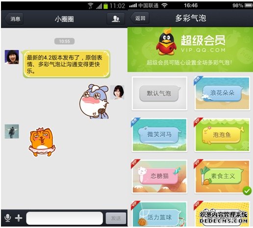 7月3日,着力于“趣味沟通”的手机QQV4.2新版正式发布。QQ独创的多彩气泡、个性主题,以及与设计师群体合作的原创表情,在新版中集体亮相,呼应“乐在沟通”的主题。附近的群、生活服务等试水性功能也同步上线。这些新特性会在iPhone和Android平台一起更新。其中,安卓平台的手机QQV4.2版本,已经在应用宝、91助手、安卓市场第一时间首发。iPhone版本也将在近日通过苹果审核后上线。 ![]() 更新4.2版本带来给力的多彩气泡。这一设计会增添聊天的乐趣:在聊天过程中,各种颜色、形状的聊天气泡会飞来飞去,形成一种新玩法,使得聊天场景不那么单调。