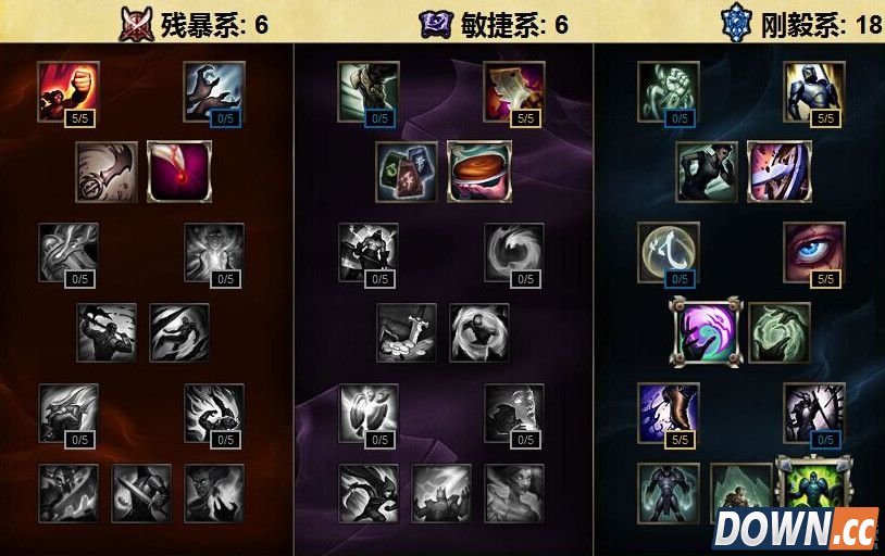凶猛系天赋(进攻) 第一层:狂怒:攻速:0.8/1.6/2.4/3.2/4% 第二层:盛宴:每杀死一名攻城小兵则治疗25点生命值,20秒冷却CD。 第三层:自然天赋:18级时使攻击力提高2/4/6/8/10,法术强度提高3/6/9/12/15。 第四层:赏金猎人:你击杀过的每名敌方英雄都会使你造成的伤害永久提升1% 第五层:粉碎重击:护甲穿透:1.4/2.8/4.2/5.6/7% 第六层:冥火之触:伤害技能会使敌方英雄受到一个相当于6+50%额外攻击力或20%额外法术强度的魔法伤害,持续3秒。(AOE和延迟类伤害则持续1.5秒,数值减半) 冥火虽然也经过了一些改动,但是对于波比来说还是不错的选择,当然选择雷霆领主的法令也是不错的选择。 坚决系天赋树(防御) 第一层:不屈:额外护甲和魔抗:1.2/2.4/3.6/4.8/6% 第二层:硬化皮肤:来自英雄和野怪的普攻伤害减少2。 第三层:老兵伤痕:额外生命值:0.8/1.6/2.4/3.2/4%总生命值 第四层:洞悉:你的召唤师技能的冷却时间缩短15%。 波比在重做了之后针对锐雯还有皇子蛮王等都非常的不错,特别是现在面对GANK的话,凭借W技能就能非常好的保命,塔下强杀也是非常难的!点出输出以后就是暴力的输出