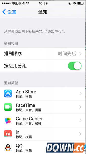 点击设置进入,然后点击【通知】一栏,再开启【按应用分组】右边滑块即可。(如下图)