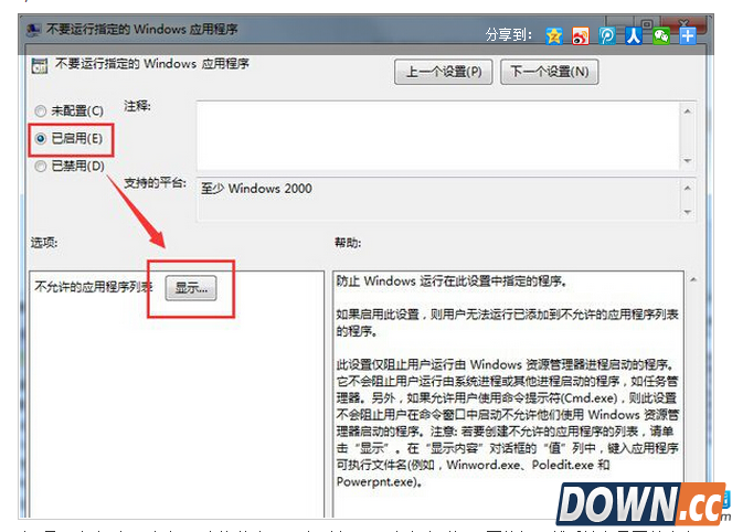 用户通过组策略可自定义控制用户、计算机、操作系统运行行为,简单的说,通过该功能可自定义控制win7系统下的指定程序不被其它人访问,这里小编为win7系统组策略为例,为大家带来禁止运行指定程序的方法! 操作步骤: 1、按下“win+R”组合键,呼出运行,在框内输入“gpedit.msc”按下回车键,打开本地组策略编辑器; ![]() 2、在“本地策略编辑器”窗口左侧依次展开“用户配置”—“管理模板”—“系统” ![]() 3、在右侧窗口找到并双击打开“不要运行指定的Windows应用程序”,在框内点击“已启用”。然后点击下面的“显示”; ![]() 4、在“显示内容”窗口中内“不允许的应用程序列表”下双击点击“值”下面的框,然后输入需要禁止应用程序全名(包括扩展名),然后点击确定即可。 ![]() 通过上述方法,我们即可在组策略中禁止用户运行指定应用程序了,这样一来不仅可防止别人获取用户计算机一些隐私或机密的程序,同时我们还可以将该功能用户禁止孩子们玩游戏等用途! 如果大家想了解更多关于软件最新资讯,请持续关注本站,本站小编将在第一时间为大家带来最好看、最有趣、最新鲜的软件资讯。更多精彩内容,尽在酷易软件园。 |