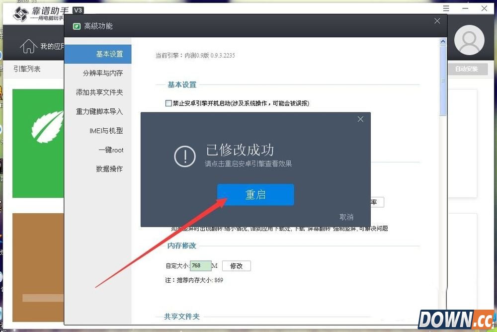 8、设置完上一步以后,是需要重启的,会弹出如下的界面,点一下重启就可以了!内存就修改好了!