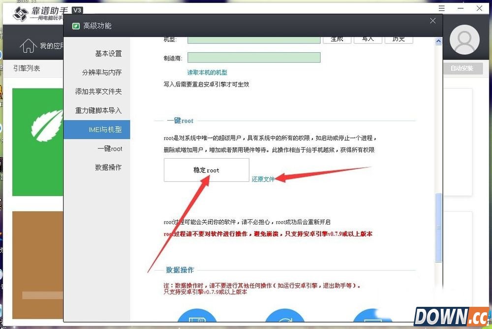 9、最后,有些软件是需要root的,在这里可以设置root,点一下图下的位置,然后如果想还原的话,可以点还原文件,很简单的!如下图!