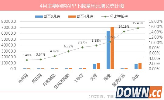 如图所示,对比截至到4月30日与3月31日的下载量可以看出,京东的增速最快,其环比增长率为15.43%;聚美优品下载量环比增长率次之,仅比京东低1.24个百分点,为14.19%;位于第三名的是淘宝,环比增长率是10.25%;增速最低的是当当网,仅为3.40%。 从中国IT研究中心发布的数据可以看出,在下载量和环比增长率方面,淘宝移动网购应用下载量第一的位置很难被改变;而京东、聚美优品的下载量排名有小幅改变,分别超越天猫和一号店,晋升一名;其他移动网购应用如当当网、易迅网、凡客诚品的下载量排名没有变化。 |