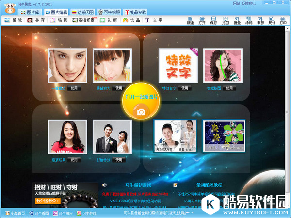 可牛影像是一款功能强大,好用的新一代图片处理软件。软件功能丰富多彩,有很多特效,制作出的图片效果很好,像很多用户在一些网上下载的带水印的图片,使用可牛影像都可以一键去除水印。下面小编就给大家简单的示范一下如何去除图片水印教程方法。 1、首先打开可牛影像,点击“打开一张图片”按钮。