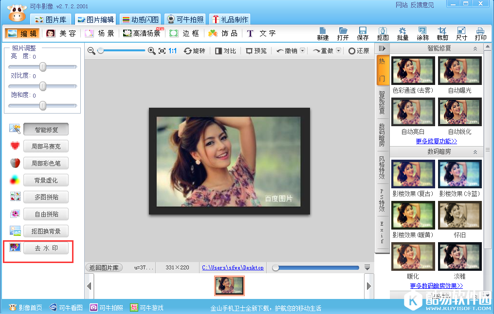 完成后,看下图示意,图片水印已经去除,看起来是不是非常奇妙。相比PS软件,这款可牛影像是不是更加方便,快捷。只需简单的三个步骤就能解决图片去除水印!需要的朋友赶紧下载试试看吧! |