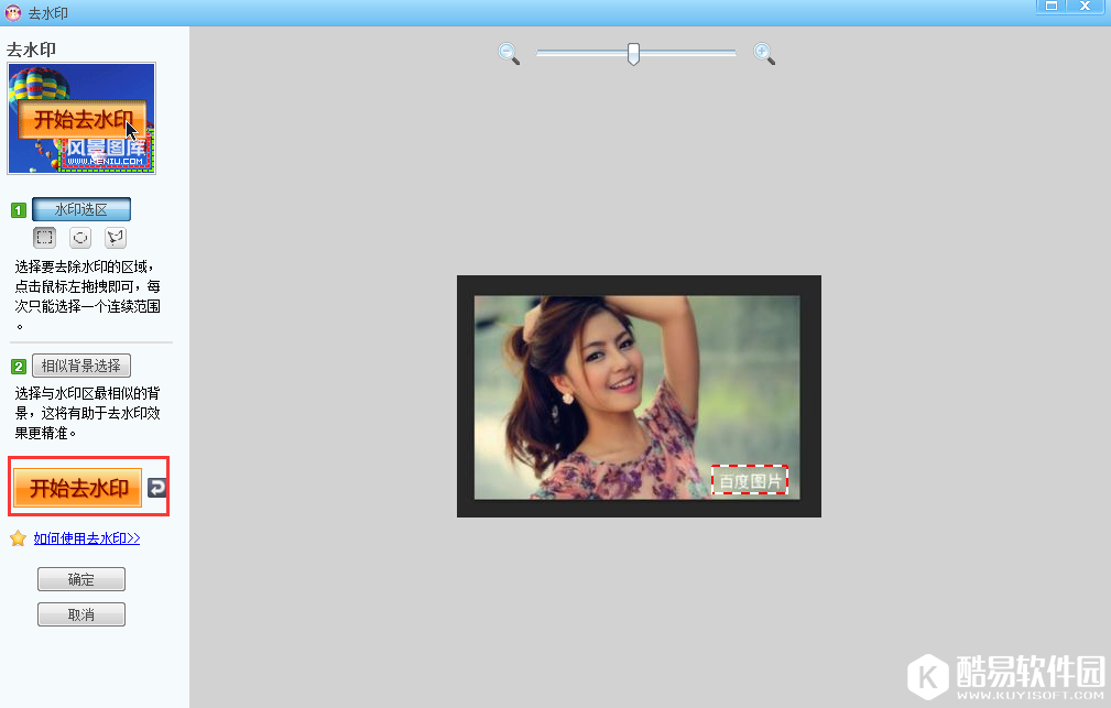 3、在显示图片去水印的界面,先通过选择的矩形框,圆形框或者是自定义,选择需要去除水印的区域,选择完成后,点击左边“开始去水印”按钮,点击完成,图片上的水印就清除了。看下图所示。