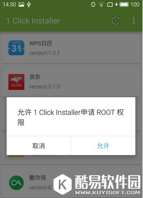 在操作后弹出的界面中,如上图所示,需要得到ROOT许可。点击允许,实现安装过程。这款一键安装apk工具最好的就是可以设置apk文件的读取目录。有时候从网盘拖了一堆apk文件放在一个目录中,为避免用户安装错误,就可以利用这个工具扫描那个目录。