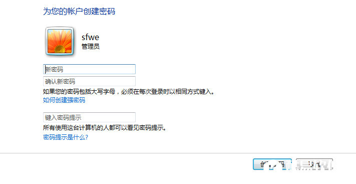 如何设置电脑用户密码? 如下图所示,在新创建的密码账户中,第一个输入框中输入要添加的新密码,第二个输入框中点击输入确认刚才的密码。接着输入密码提示,所有使用这台计算机的人都可以看见密码提示。