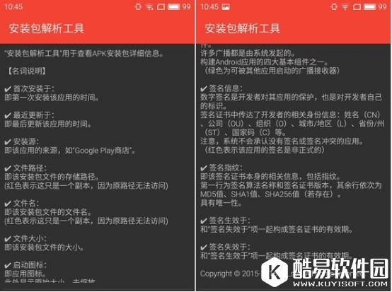我们安卓手机上很多软件都是通过APK安装包来安装的,安卓App的APK安装包包含了很多信息,像开发商的签名、App的图标等等都在其中。有时我们需要对APK安装包做一些编辑修改,可是要怎么做呢?安装包解析工具是一款相当实用的APK工具,可以将杂乱无章的APK文件名重命名为规则的名字,提取App的图标等等。 安装包解析工具是用来解析APK安装包,从而实现各种功能的。而且非常干净小巧,体积仅有161K,权限只申请了一个。而且在安装后,它不会在桌面产生快捷方式,真是良心制作啊!