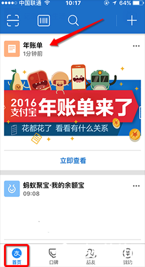 2016年已经正式完结了,支付宝也已经更新了每一位用户的2016年度账单,想知道你在过去的2016年到底消费了多少吗?那就来支付宝账单看看吧,它可以很直观的看到你在这一年的“剁手”数据哦。。。那么支付宝年度账单怎么查询呢?接下来,就跟着小编一起来了解下吧。 支付宝年账单怎么看? 1、打开手机上的支付宝App,现在新版的支付宝在下方4个选项中的“首页”中都会显示用户的最新动态,在最新动态中,用户即可看到自己的支付宝2016年账单。