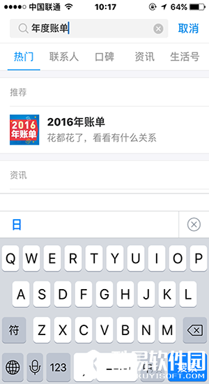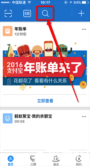2、或者,如果用户设置了屏蔽动态的选项而在“首页”看不到自己的2016年账单的话,还可以通过上方的“放大镜”搜索,进行搜索年账单,如下图所示也可以看到自己的2016年账单。