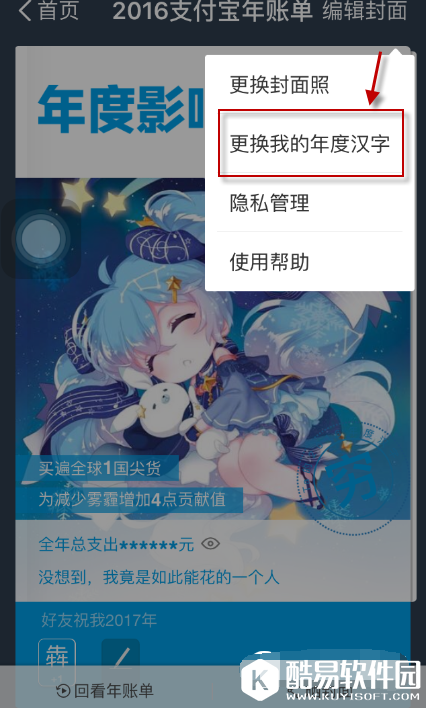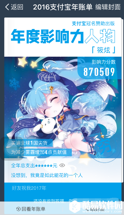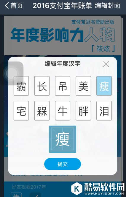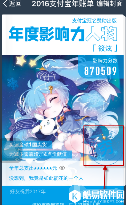 小编这两天的心情真的是难以形容啊,朋友圈已经被支付宝年度账单给彻底刷屏了,各种秀支出炫影响力,简直是受到一万点暴击伤害啊。。。。。当然了,也有通过修图来逗比一把的,支付宝2016年的个人年账单正式出炉,可以说是给了很多小伙伴们来了解一个自己的具体的消费的情况了,并且还能够在支付宝2016年账单的最后,生成自己的年度封面,而且还能够给自己选择一个年度汉字来概括自己这一年的各种大小的事物,不过年度汉字选择完毕后,还能不能更改呢?究竟如何生成2016支付宝年账单封面呢?接下来,小编就给大家介绍2016支付宝年账单封面生成方法,以及更改支付宝2016年账单年度汉字的方法,一起来看看吧。 如何生成2016支付宝年账单封面?在支付宝的年账单中,一直滑到最后,就可以来选择一个自己的年度汉字了,也可以自己来填写,然后点击确定,就可以顺利的生成自己的年度封面了。