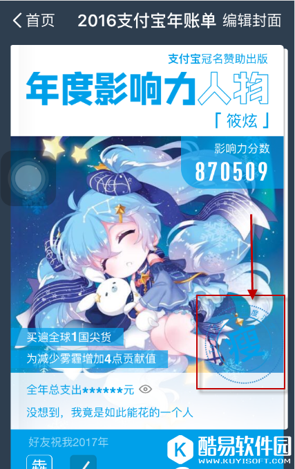 更改支付宝2016年账单年度汉字教程打开支付宝,可以看到自己的支付宝的年度封面中的有着一个专属的汉字,