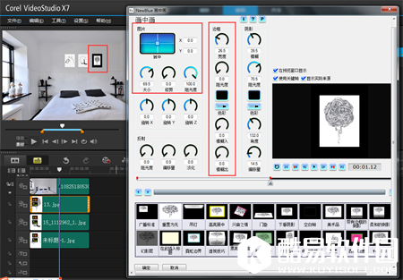 2、而后点击“滤镜按钮”,将“画中画滤镜”拖动到需要的素材上,在“属性栏”中设置“自定义滤镜”,在弹出的对话框中,首先设置图片的位置、大小、边框宽度、阻光度、将其设置为自己喜欢的样式,设置如下,如果不会自定义滤镜的可以参考:【会声会影x8】 自定义滤镜设置。