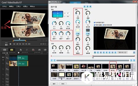 2、为其添加“画中画滤镜”,点击“自定义滤镜”,首先点击下方的“重置为无”,而后点击“美术品”,设置其旋转轴的数值,使其具有立体感,设置其边框的模糊度,使其更具美感,设置如下,设置时需要观看预览窗口上的,而不是滤镜中的,如下图所示