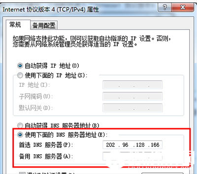 在“Internet 协议版本4属性”对话框中即可更改DNS地址了,选中“使用下面的DNS服务器地址”,然后DNS地址成为可编辑状态,再把我们查看到的DNS地址填写上再确认即可。 首选 DNS 服务器(P) 202.96.128.166 备用 DNS 服务器(A) 202.96.134.133