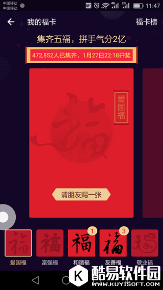之前,小编给大家介绍了支付宝春节再次推出了“五福红包”活动,表示要“把欠大家的敬业福都还给大家”。1月18日,支付宝集福活动正式开启,和去年一样,需要收集“五福”: 富强福、和谐福、友善福、爱国福和敬业福。还不知道支付宝福卡活动怎么玩的小伙伴们可以一起来看一下。 支付宝五福怎么领? 大家打开手机支付宝,在首页就能看到活动入口,使用AR扫一扫任意“福”字,就有机会领取三张福卡。 比如扫下面这个“福”字↓↓↓
