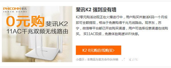 1、公司介绍:斐讯数据通信技术有限公司(以下简称斐讯)成立于2009年,是一家致力于向客户提供移动终端、数据通信产品、云计算等技术设备及整体解决方案和服务的高新技术企业公司,集研发、制造、销售于一体,客户涵盖电信运营商、个人消费者、企业客户、政府机构、行业客户等不同领域。斐讯全球总部位于中国上海,在欧洲、美洲、亚太、非洲设有20多家分支机构,并在德国慕尼黑、美国硅谷设有研发基地。历经6年快速发展,斐讯以每年200%的增速,成长为年销售规模超过100亿元的中国电子信息100强公司(2015年电子百强第51位),其电信网络产品、技术服务和解决方案及智能终端已应用于全球70多个国家和地区。斐讯坚持以客户为中心,基于满足客户需求而注重创新,2014年专利申请总数达995件,专利申请数在上海名列前三。斐讯坚持做有理想的企业,以“致力于更自由的沟通”为使命,以“激情发展、追求卓越、客户价值、共同成长”的核心价值理念,坚定成为信息通讯领域卓越的设备及服务提供商。所以公司看起来还是挺可靠的,这么大的实体产业,跑路的可能性并不大 2、K2零元购活动现正在火爆进行中,用户购买并激活K码一个月后即可全额提现,相当于免费购得千兆无线路由。现京东自营,苏宁,微信等平台都已开放购买渠道,当然如果提现不了,京东自营是要承担责任的。
