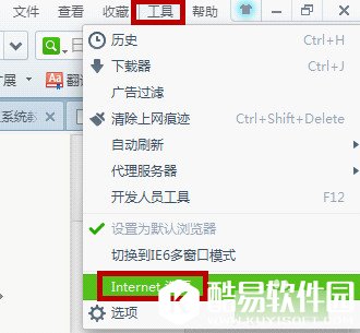 方法一:清理浏览器缓存。 进入浏览器的“工具”,这时候的菜单选项中,点击“internet”选项。