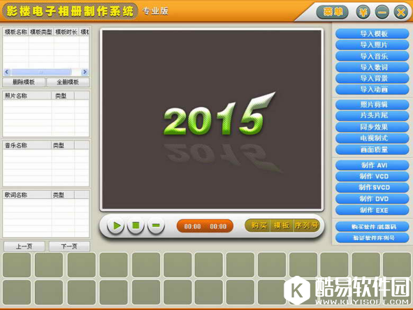 软件介绍 影楼电子相册制作系统是一款专业的电子相册制作软件,只要导入模板,导入照片,导入音乐,导入歌词,软件就会自动处理,自动分析,自动同步,自动匹配,所有的工作全部由软件自动完成,大量节省了时间。软件支持二种同步效果,可以随模板同步,也可以随音乐同步,支持画面质量设置,让用户在制作时有更多的选择。【影楼电子相册制作系统】使用于影楼部门,数码部门,照相部门,摄影部门,旅游部门,学校,等等。 软件功能 1、导入模板功能; 对导入的模板支持预览,支持多模板导入,可以连续导入多个模板。 2、片头片尾功能; 支持MPG,AVI,DAT格式的片头片尾视频。 3、导入照片功能; 支持JPG格式的照片导入,对导入的照片可以自动剪辑,支持多张照片连续导入。支持导入的照片自动剪辑功能,您要做的只是把照片导入软件中,所有的工作全部由软件自动完成,为用户节省了大量的时间。 4、同步效果功能; 支持二种同步效果,可以随模板同步,也可以随音乐同步。 5、导入音乐功能; 支持音乐类型为MP3格式,对导入的音乐无需转换,直接可以使用,支持多个音乐连续导入。对导入的音乐,软件自动处理,自动分析,自动匹配。 6、导入歌词功能; 软件采用LRC方式,实现了歌词与音乐的同步显示功能,而且软件还支持多个LRC歌词连续导入和显示功能,为了达到用户的要求,增加了LRC歌词调整功能,用户可以对LRC歌词进细节的调整,例如:LRC歌词居左,居中,居右,颜色设置,歌词位置设置等等。 7、照片剪辑功能; 支持照片剪辑功能,由于软件采用照片不失真剪辑,所以照片剪辑后不会出现照片失真现象,不会出现照片走形现象。 8、同步效果功能; 支持二种同步效果,可以随模板同步,也可以随音乐同步。 9、画面质量功能; 支持画面质量设置,让用户在制作时有更多的选择。 使用教程 运行影楼电子相册制作系统,进到软件的主界面上。首先下载一个电子相册模板,打开之后,选中照片,鼠标右键单击选择更改图片,然后就可以把我们的照片替换到模板中去。