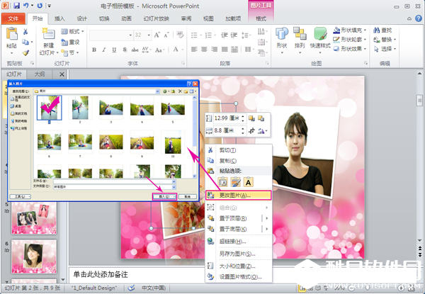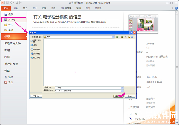所有照片都替换完成之后,可以选择另存相册,则可以保留原相册模板。打开菜单栏的“文件”选项,然后选择另存为,就可以在弹出的另存对话框内对相册进行命名再保存。ppt相册就初步成型了。