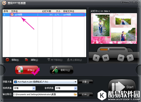 打开影楼电子相册制作系统,通过主界面上的“添加”按钮,把我们刚制作好的ppt相册导入软件。