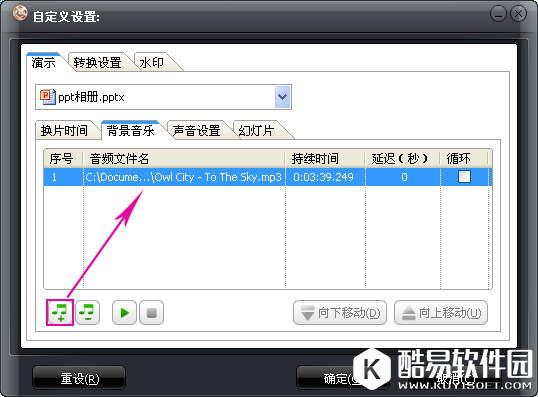 影楼电子相册制作系统免费版还可以给电子相册添加背景音乐,点击自定义按钮,进入“背景音乐”选项,就可以添加一首或多首歌曲作为电子相册的背景音乐。