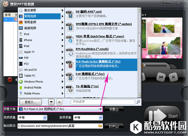 设置电子相册的视频格式,若是用于网络传播的建议大家选择flv格式,若是需要刻录DVD光盘的,则可以使用vob格式,还可以直接根据播放设备选择视频格式。