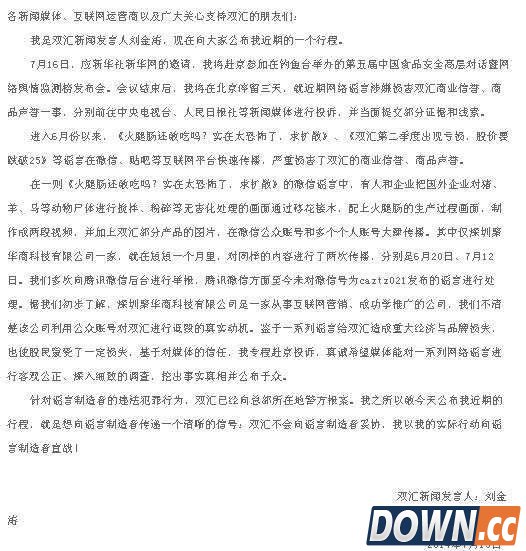 中新网财经频道从双汇官方网站获悉,双汇新闻发言人将进京向数家中央媒体投诉近期网络谣言涉嫌损害双汇商业信誉、商品声誉一事,并将提交部分证据和线索。 双汇新闻发言人、总裁助理刘金涛在其公司官网发表声明称,进入6月份以来,《火腿肠还敢吃吗?实在太恐怖了,求扩散》、《双汇第二季度出现亏损,股价要跌破25》等谣言在微信、贴吧等互联网平台快速传播,严重损害了双汇的商业信誉、商品声誉。 ![]() 双汇新闻发言人刘金涛致媒体的公开声明。 来源:双汇官方网站截图 刘金涛介绍说,在一则《火腿肠还敢吃吗?实在太恐怖了,求扩散》的微信谣言中,有人和企业把国外企业对猪、羊、马等动物尸体进行搅拌、粉碎等无害化处理的画面通过移花接木,配上火腿肠的生产过程画面,制作成两段视频,并加上双汇部分产品的图片,在微信公众账号和多个个人账号大肆传播。其中仅深圳聚华商科技有限公司一家就在短短一个月里,对同样的内容进行了两次传播,分别是6月20日、7月12日。 “我们多次向腾讯微信后台进行举报,腾讯微信方面至今未对微信号为caztz021发布的谣言进行处理。据我们初步了解,深圳聚华商科技有限公司是一家从事互联网营销、成功学推广的公司,我们不清楚该公司利用公众账号对双汇进行诋毁的真实动机。”刘金涛说,鉴于一系列谣言给双汇造成重大经济与品牌损失,也使股民蒙受了一定损失,基于对媒体的信任,他将专程赴京投诉,真诚希望媒体能对一系列网络谣言进行客观公正、深入细致的调查,挖出事实真相并公布于众。 刘金涛还介绍,“针对谣言制造者的违法犯罪行为,双汇已经向总部所在地警方报案。之所以公布自己近期的行程,就是想向谣言制造者传递一个清晰的信号:双汇不会向谣言制造者妥协,我以我的实际行动向谣言制造者宣战!” |