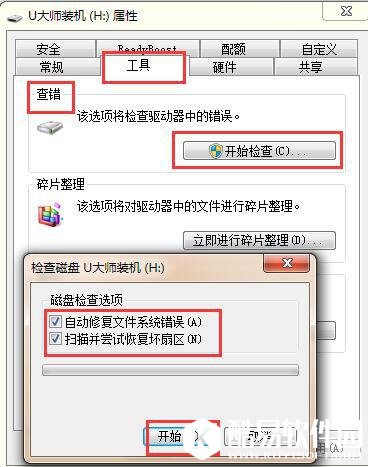 u盘作为一款存储工具,具有体积小、内存大、易于携带等优点,已经成为我们日常学习、工作的好帮手。在使用U盘的过程中,想必很多用户都遇到过无法复制u盘文件的情况吧,这是什么原因造成的呢?该怎么解决呢?接下来,小编就为大家介绍几种u盘文件无法复制的解决方法,一起来了解下吧。 一、U盘分区损坏 原因分析:没有安全删除硬件就直接拔掉u盘或感染病毒等,都有可能导致磁盘分区表信息损坏。 解决方案: 1、鼠标右键U盘,选择“属性”后,点击“开始检查”,在弹出的窗口中将“自动修复文件系统错误(A)”和“扫描并试图恢复坏扇区(N)”这两项前面打上勾然后点击“开始(S)”进行检查修复。
