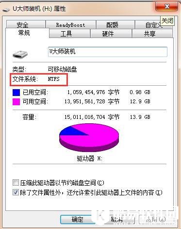 原因分析:当确定U盘空间足够之后,文件却无法复制,那么就是因为U盘格式的问题了。常见的U盘格式有“FAT32”和“NTFS”两种,而FAT32格式的U盘最大只能支持4GB的文件操作,所以要转换成NTFS格式。 1、首先查看U盘格式,右击U盘,点击“属性”便可看到U盘的格式