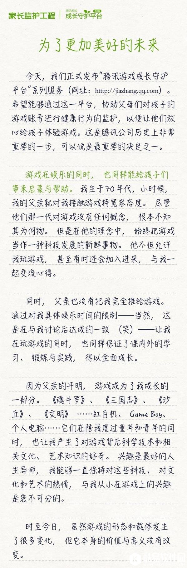 除此之外,另设家长监护专线,由专人协助家长解决未成年人游戏问题。对一些额度的疑似未成年人消费,会发起主动关怀和确认,帮助不知情的家长,及时了解子女游戏消费问题。 据了解,家长可开启网站内“提醒”功能,孩子如进入游戏将第一时间发送短信提醒;短信提醒服务完全免费,腾讯公司不会收取任何短信费用,如您在运营商开通任何短信套餐,则此费用由运营商收取。 此外,家长可通过网站内的“设置”功能,进行以下操作: 1、一键禁玩:允许或禁止孩子玩游戏; 2、消费设置:可设置孩子帐号在游戏内的每次消费及每月消费限额,目前仅支持QQ帐号消费限额。 3、时段设置:可选择具体时间段允许孩子适当的玩游戏,合理控制孩子玩游戏时长。 家长还可通网站内“查询”功能查询孩子帐号最近7天的游戏消费记录。 附腾讯游戏公告全文: