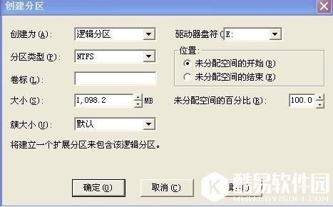创建为,因为C盘是主分区,所以我们现在创建的分区选择为逻辑分区,也就是默认的,可以按照自己所需的去选择哦。 分区类型:这里有fat,fat32 ntfs LINUX等格式,可以按照自己所需不同去选择,这里我们选择fat32 卷标:可以根据自己喜欢的设置磁盘分区的名称,比如kuzhuai或者软件, 大小:默认的是全部的未分配容量,可以根据实际需求不同来选择,这里我将它设置为5000M因为我还想分一个分区哦 簇大小:默认的就可以,无须去修改 驱动器盘符:默认的是E 位置:这里默认的就可以,不需要去多加修改 未分区的百分比:如果想将未分配空间 全部分为一个分区,哪里这里的百分比就选择100% 我这里要分出两个区,每一个区容量一样,所用就选择50% 输入50 选择好后,点确定,请看图片
