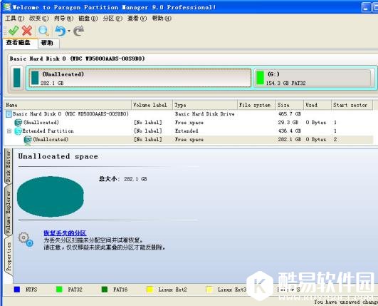 这里显示的是pq扫描磁盘程序,扫描完毕后.会停住,这个时候按Num lock灯会不闪,处于死机状态,大家不要在等,因为等半天他还是定在哪里,这个时候直接按机箱上的REST键重起即可,强行重起后,登陆系统,在打开PQ 运行PQ后,此时在右边的硬盘分区详细资料栏中会出现新的一行,类型是未分配,选中该行, 鼠标右键 选择创建(T)
