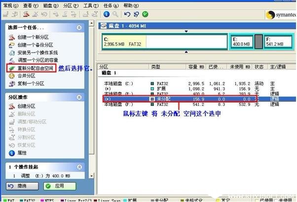 二、 从一盘分一部分空间到另一个盘 注意两个盘必须相邻 注意,两个盘必须相邻的意思是:比如你有C,D,E,F或者更多的分区。你只能将C往D,D和E,E和F,必须相邻的才可以。 首先得先从一个分区里划分出一些空间来,划分后就是未分配的空间啊,我这里要把C盘的空间划分到D盘,注意邻近的分区才可以划分哦,划分新空间的方法和上面 从一个分区中分割出一部分空间,创建新的分区的操作方法一模一样。 这里我以E盘为例,将E盘的空间划分给F盘。现在我已经划分出未分配的空间,是从E盘划分出来的,鼠标左键选中未分配的空间,然后选中左边,选择一个任务里的重新分配自由空间,请看图片
