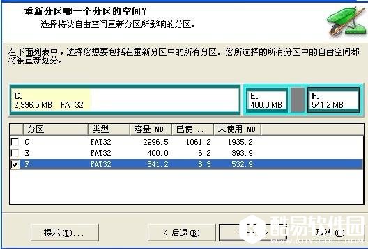 这里要我们选择把未分配的空间为邻近的分区,E盘的邻近分区是F盘,空间是从E盘划分出来的,又把划分出来的空间,划回去,这样不是没有意义吗?所以这里选择F,我们这里以划分给F盘为例,选中F盘,把其他的C和E前面的勾去掉,然后点下一步,请看图片 然后点完成,在点应用,将激活下面的窗口