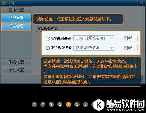 软件介绍 呱呱K歌伴侣是一款专业的音乐K歌软件,软件拥有数十万首歌曲、同步歌词、卡拉OK效果以及多种独特的音频特效,粗细声随你调节,高清原版的伴奏,支持独立下载,且不断更新。音乐即点即听,可录音录像,支持自定义屏幕捕捉画面。此外,软件还具有缺歌登记、特效文字、色彩调节、变声音效、一键截图、醒目的歌词标记等功能。 软件特色 1、音乐即点即听 随时在线试听,不必等待,不必下载。试听时也可选择同步下载。 2、屏幕捕捉 自定义屏幕捕捉画面,操作简单方便,让交流不再有阻挡。 3、录音录像 记录自己精彩的时刻,只需点击屏幕下方的录制按钮,方便快捷。 4、缺歌登记 缺歌登记,我们负责为您寻找高品质的歌曲。 5、特效文字 视频上添加文字,随意摆放位置,随意设计文字效果。 6、色彩调节 为自己的视频添上彩虹的颜色,多种色彩效果,供你选择。 7、变声音效 为朗诵配音的爱好者提供施展才华的空间。各种声音一人搞定。 8、一键截图 留下自己美丽的瞬间,一键搞定。图片清晰,固定位置保存。 9、醒目的歌词标记 一目了然,寻找歌词的伴奏易如反掌。 使用方法 一、视频设置 1、视频设置中虚拟视频新增呱呱虚拟视频 在“设备管理”中,选择视频设备。选中“usb视频设备”时,将启动相对应的usb摄像头;选中“虚拟视频设备”时,未安装其他虚拟设备时默认启动呱呱虚拟视频画面