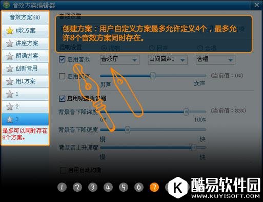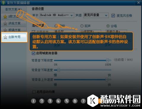 二、音效方案 1、官方推荐音效方案新增至4个 官方推荐方案由K歌,朗诵,讲座3种方案新增至4个;增加“创新专用方案”