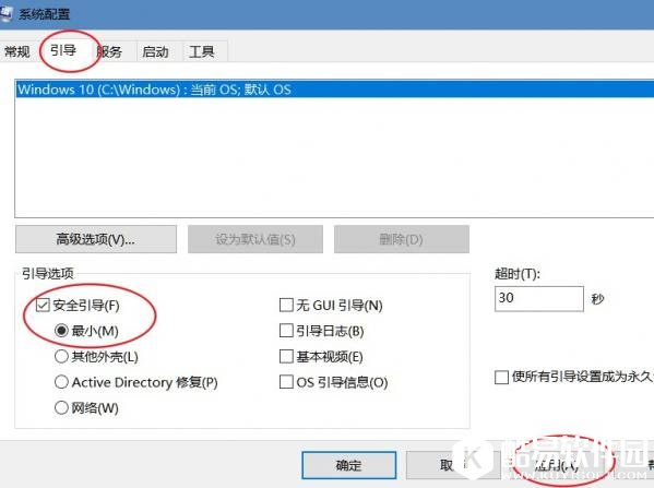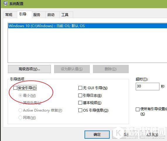 2、在打开的“系统配置”窗口中,选择“引导”,然后勾选“引导选项”中的“安全引导”,默认会选择“最小”,这时我们点击“应用”后确定,会弹出下面的窗口;