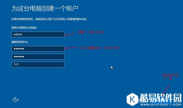 8、短暂的等待后出现为电脑创建一个账户的提示,此时输入帐户名如:udashi,密码可以设置也可以暂时不设置,这里随意。
