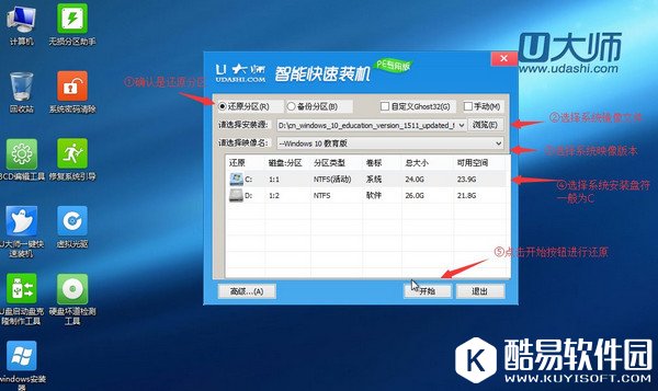 选择还原分区后,点击选择确认安装源中的系统映像,(如果没有自动显示请检查文件名等是否异常,文件夹目录是否异常)然后选择映像中自己想安装的版本,本图中为windows 10教育版,专业版等其他版本一样同理安装。(PS :如果是新装电脑或者是原装系统进行改系统等则参考U大师的另外的教程说明)