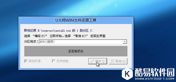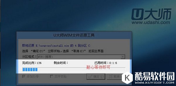 5、格式化界面会很快进行完然后会出现如下图所示滚动条,在这里U大师提醒各位网友,这个时候千万不要动U盘和电脑,不然容易出现意想不到的问题,经过U大师测试,一般情况下安装原版的win10 X64位教育版(专业版)这个滚动条大概一般机器要用5分钟左右的样子,老机器时间相对长一些,耐心等待完成就好了