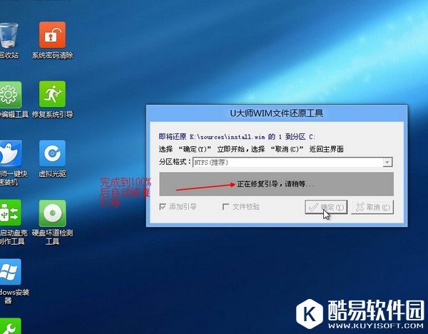 6 、耐心等待进度条到百分百后,就会提示还原成功,并自动修复系统盘主引导记录。且显示还原成功完成,您的计算机将在10秒内重启,这里需要拔掉U盘,然后点击立即重启,如下图: