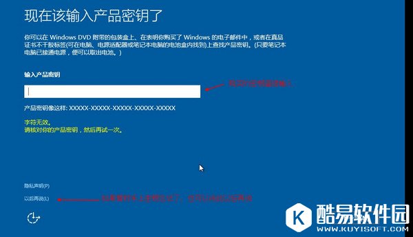 5、系统接下来提示 输入电脑的系统密钥,此时有则输入点下一步,忘记或者暂时无法输入,请点击下图所示以后再说。(这里以暂不输入密钥为例)
