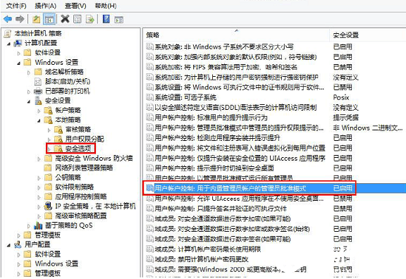 解决方案四、允许管理账户使用内置程序 进入win10系统组策略,定位到计算机配置--Windows配置--安全设置--本地策略--安全选项,下拉,双击进入“用户账户控制:用于内置管理员账户的管理员批准模式;选择已启用项,应用,确定,注销后再登录。