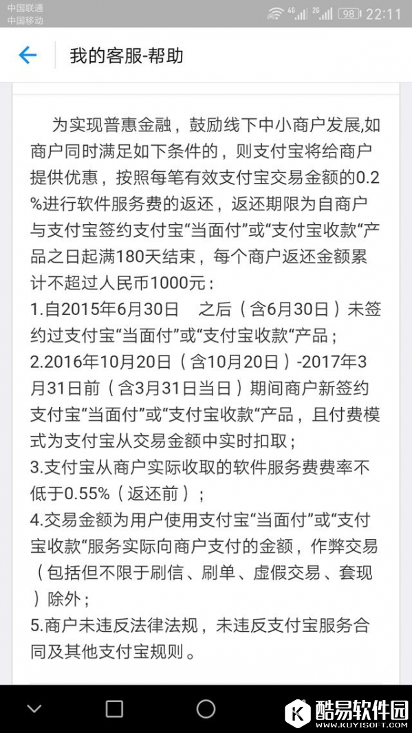 5.直接关闭或者返回支付宝首页。(重要的事情说三遍:不需要扫码激活!不需要扫码激活!不需要扫码激活!) 6.点击支付宝首页最下方“朋友”导航。搜索“蚂蚁金服商家平台”并关注。 7.进入“蚂蚁金服商家平台”点击右下方“我的”、在“我的收款码”中即可看到您的收款码。将收款码保存到手机或者打印出来即可。 注意事项 刚开通的收款码消费者付款限额在5000以内,这个限额会根据商家的交易不断调整。 刚开通的收款码没有花呗支付功能,需正常交易50+笔以后,支付宝审核开通。 最后也是最重要需要说明的一条是,当天支付宝余额提现依然按照之前的收费标准收费,第二天9点后提现才可免费。 附上支付宝收款码收费标准