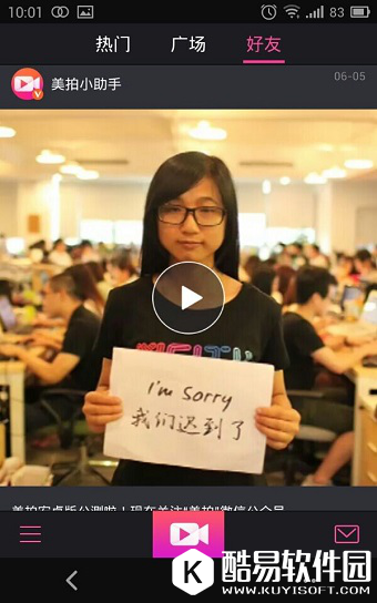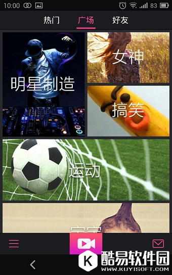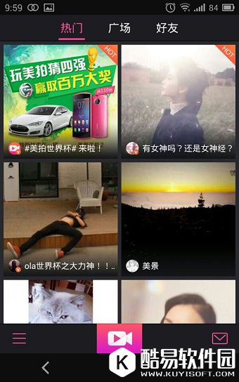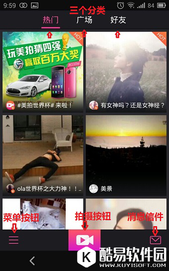 美拍基本用法介绍 1、下载最新版美拍,进入美拍后能看到上方的三个分类和下方的菜单、拍摄按钮、消息信件,每个分类都有很多有趣的短视频。
