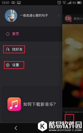 5、点击菜单按钮,侧滑出一个窗口,可以设置或者登录、找朋友,目前只支持新浪微博和face。